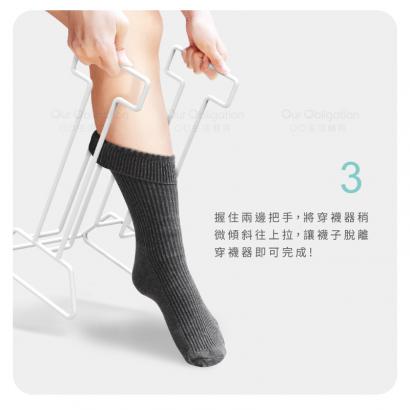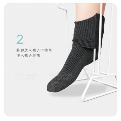 將襪子套在穿襪器上,站起即完成穿襪動作。 若您對產品資訊有任何疑問,歡迎來電(02)2809-1908,將有專人為您服務。