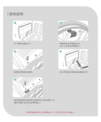 安全帶兩末端有鐵環扣眼,只需將輪椅座椅最內兩側之螺絲鬆開,連同此安全帶一併鎖緊固定即可。