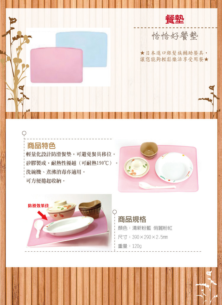 ★輕量化設計滑餐墊,避免餐具移位,幫您解決餐具滑動的困擾,有了它更能享用食物的美味