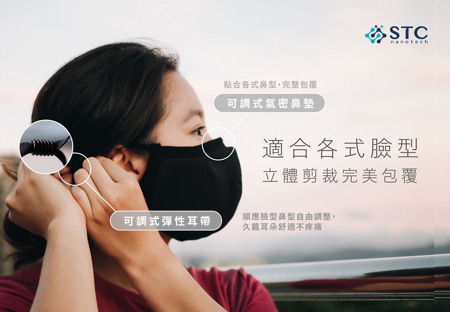 結合台灣STC Nanotech以光學分散技術研發的奈米抗菌材與瑞士HEIQ抗菌技術, 防潑水抗過敏親膚布料,經SGS、MIS國際認證實驗室研究證實可在幾分鐘內抑制口罩表面病毒、細菌及微生物。 內置STC高氣流量設計結構於口罩內形成3D立體氣流室,增加換氣效率且說話運動無阻礙。 可調式耳帶及氣密鼻墊,能完美貼合各式臉型、完整包覆,久戴舒適不疼痛。 使用方法: 將 STC Nanotech銀離子抑菌防護墊放入 3D立體氣流室防護口罩套內,並依個人臉型調整耳帶上下長短及氣密鼻墊,讓口罩完全包覆口鼻。