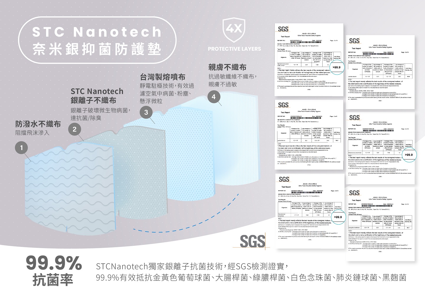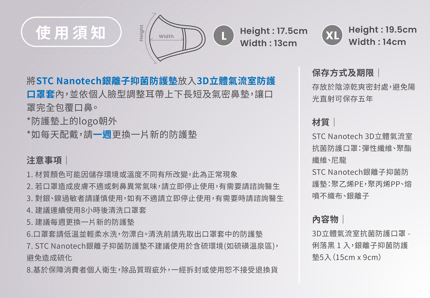 注意事項: 1.材質顏色可能因儲存環境或溫度不同會有所改變,此為正常現象。 2.若口罩造成皮膚不適或刺鼻異常氣味,請立即停止使用,有需要時請諮詢醫生。 3.對銀、鎳過敏者請謹慎使用,如有不適請立即停止使用,有需要時請諮詢醫生。 4.建議連續使用八小時後清洗口罩套。 5.建議每週更換一次銀離子抑菌防護墊,以確保 99.9%抑菌功效。 6.銀離子抑菌防護墊不建議使用於含硫環境(如硫磺溫泉區),避免造成硫化。 7.口罩套可水洗,勿漂白,清洗前請先取出口罩套中銀離子抑菌防護墊。 8.基於保障消費者個人衛生,除品質瑕疵外,一經拆封或使用恕不接受退換貨。 內容物: 3D立體氣流室抗菌防護口罩*1、銀離子抑菌防護墊5入(15cm*9cm) 產品保存方式及期限: 存放於陰涼乾爽密封處,避免陽光直接照射,可保存五年。 材質 STC Nanotech 3D立體氣流室抗菌防護口罩:彈性纖維、聚酯纖維、尼龍 STC Nanotech 銀離子抑菌防護墊:聚乙烯PE、聚丙烯PP、熔噴不織布、銀離子