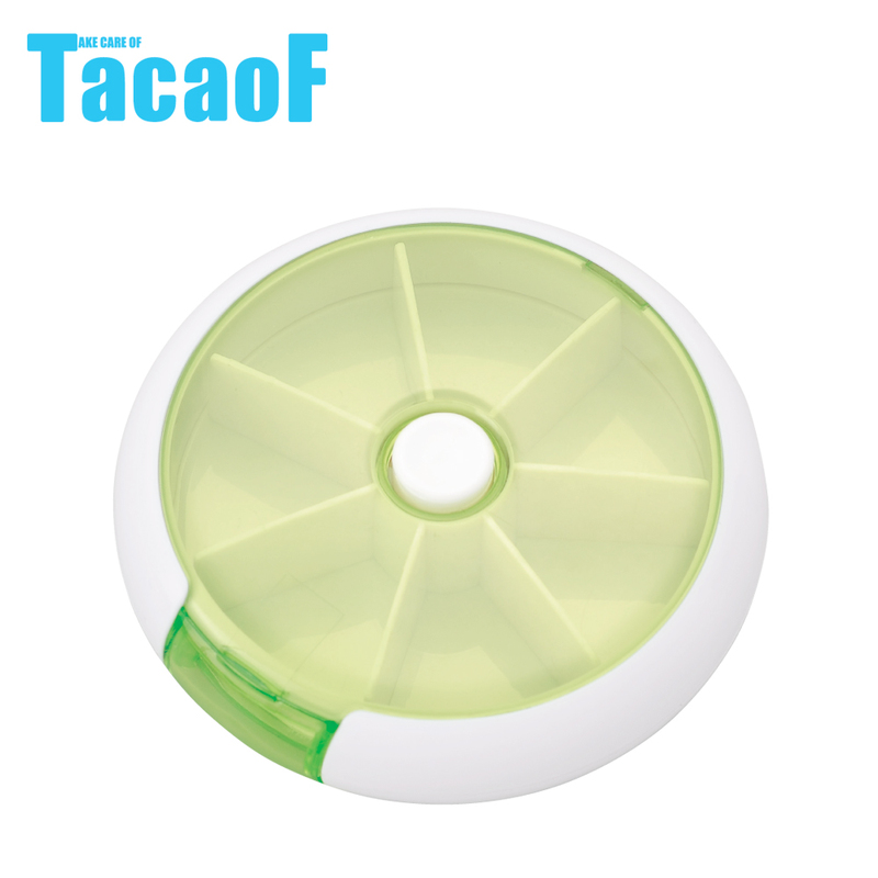 1. 小巧可愛,擕帶方便. 2. 上蓋掀開,顆粒藥可一次分裝. 3. 按押中央白色押鈕,放置格會自動旋轉