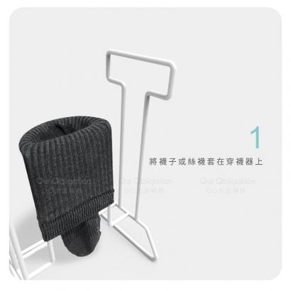 將襪子套在穿襪器上,站起即完成穿襪動作。 若您對產品資訊有任何疑問,歡迎來電(02)2809-1908,將有專人為您服務。