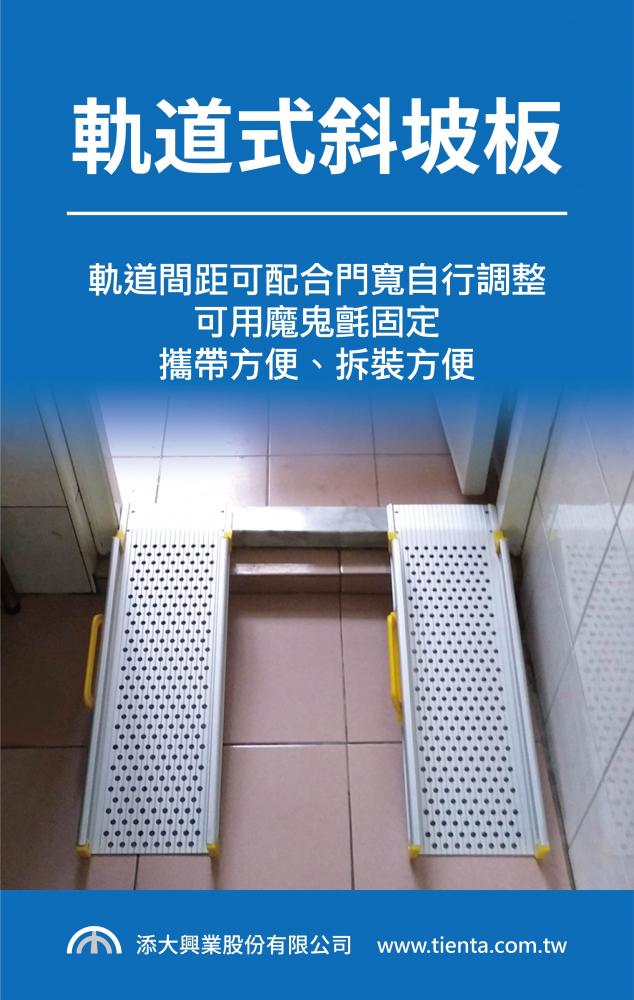 軌道式斜坡板 TT2-16-61 [類別] 行動輪椅 | 輪椅斜坡板 原價 3,600 網路價 3,600 鋁合金軌道式斜坡板可自行調整二條軌道間距,以適用不同輪距與門檻寬度 產品特色 產品規格 購物說明 檔案下載 產品特色 Features 適用於浴室狹窄門檻寬度 產品規格 Specification ●型號TT2-16-61 ●內寬X長(CM):16*61 ●重量:3kg ●承重:300kg ●適用高低差:10公分以下 ●補助項目:非固定式斜坡板A款 購物說明 Product manual 檔案下載 Download 資料來源:添大興業股份有限公司
