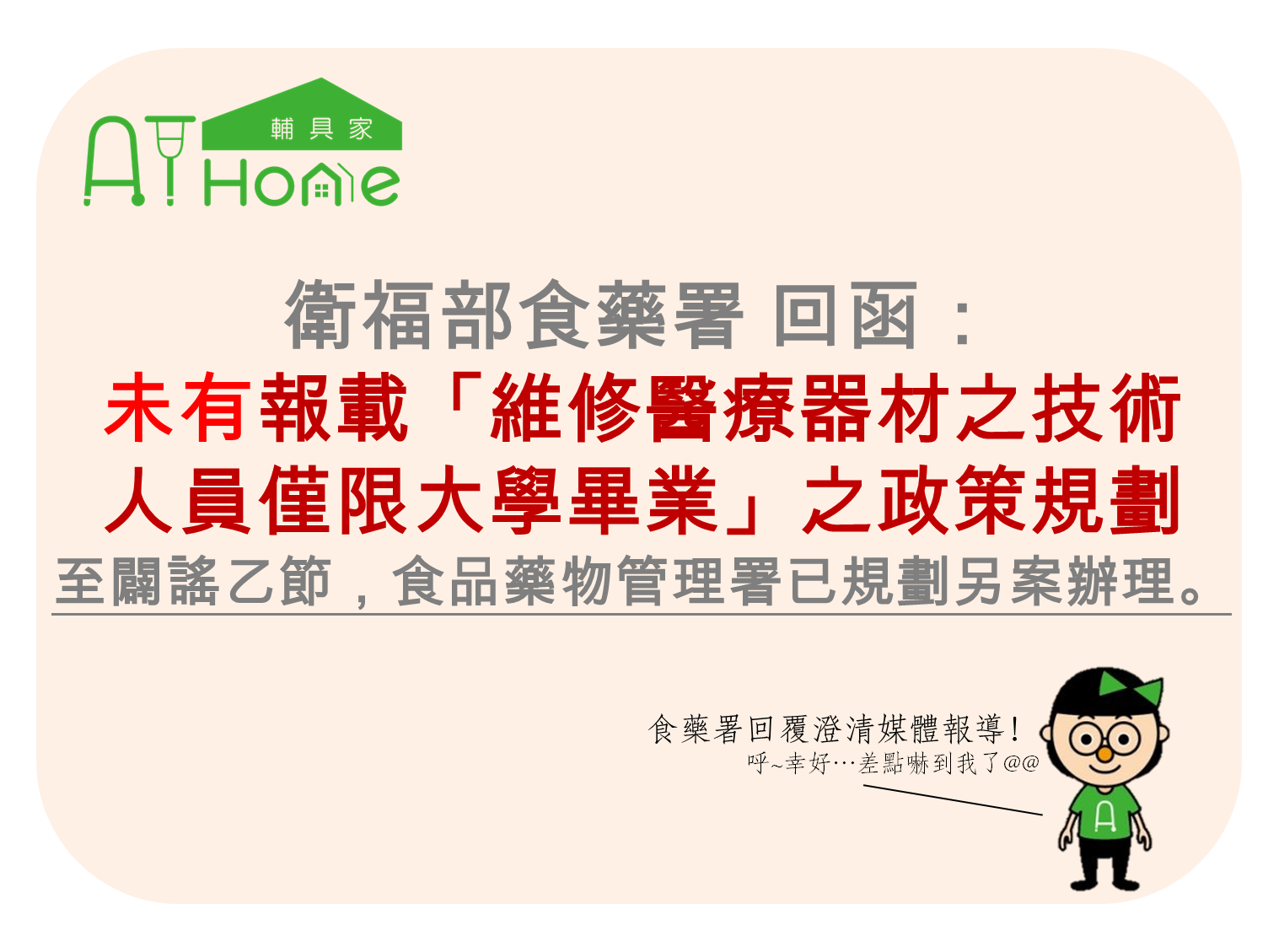 食品藥物管理署:未有報載「維修醫療器材之技術人員僅限大學畢業」之政策規劃,至闢謠乙節,食品藥物管理署已規劃另案辦理。