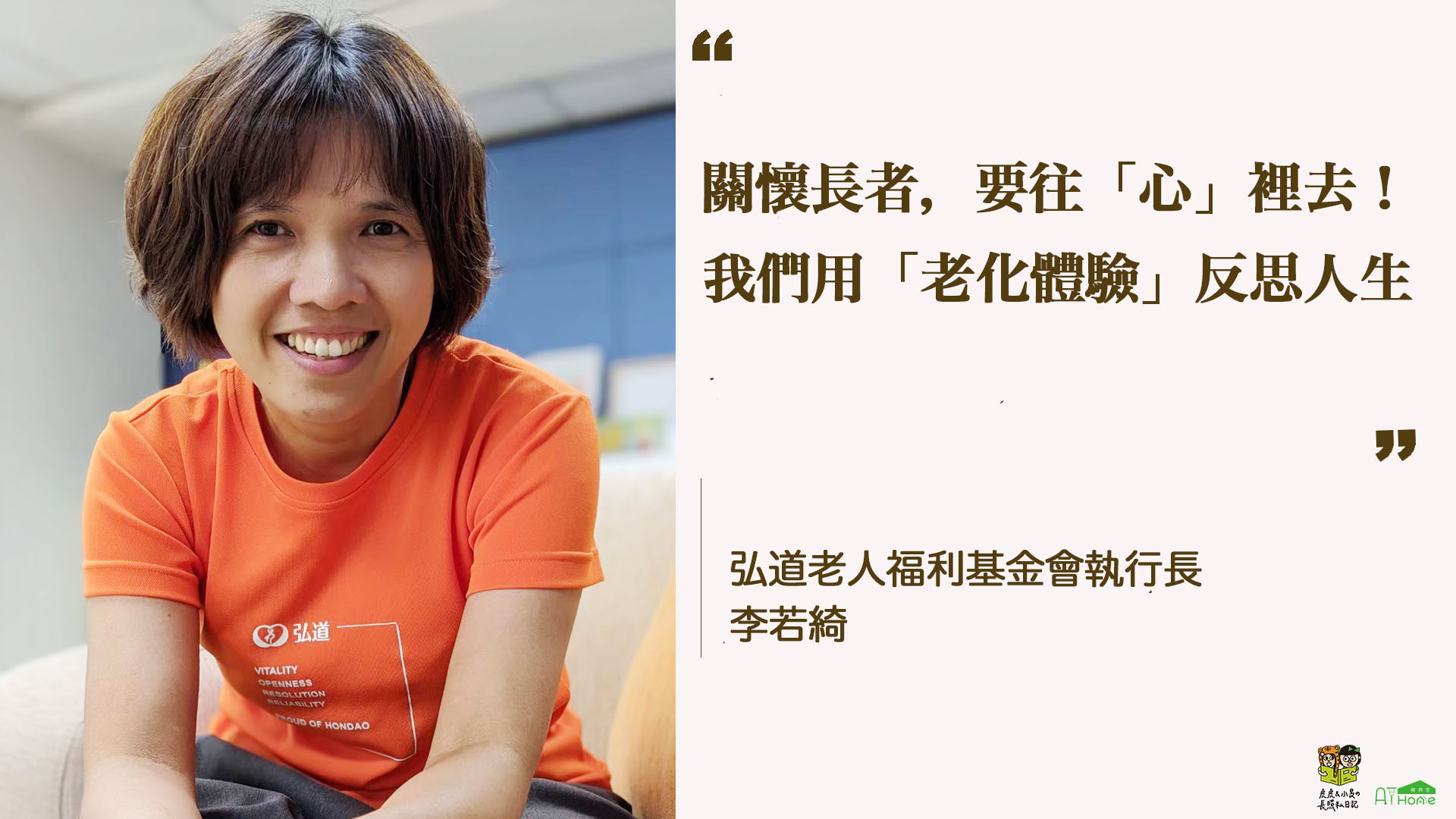 2021.10.30關懷長者,要往「心」裡去!弘道執行長李若綺:我們用「老化體驗」來反思自己的人生李若綺說,要可以感同身受別人並不容易,藉著這樣的沈浸式體驗活動設計,我們能從原本的角色裡跳脫出來,去感受他人之不便,進而在我們心底埋下一顆種子,用同理心去滋養它,終究會結實纍纍,化成改變社會的力量。 -