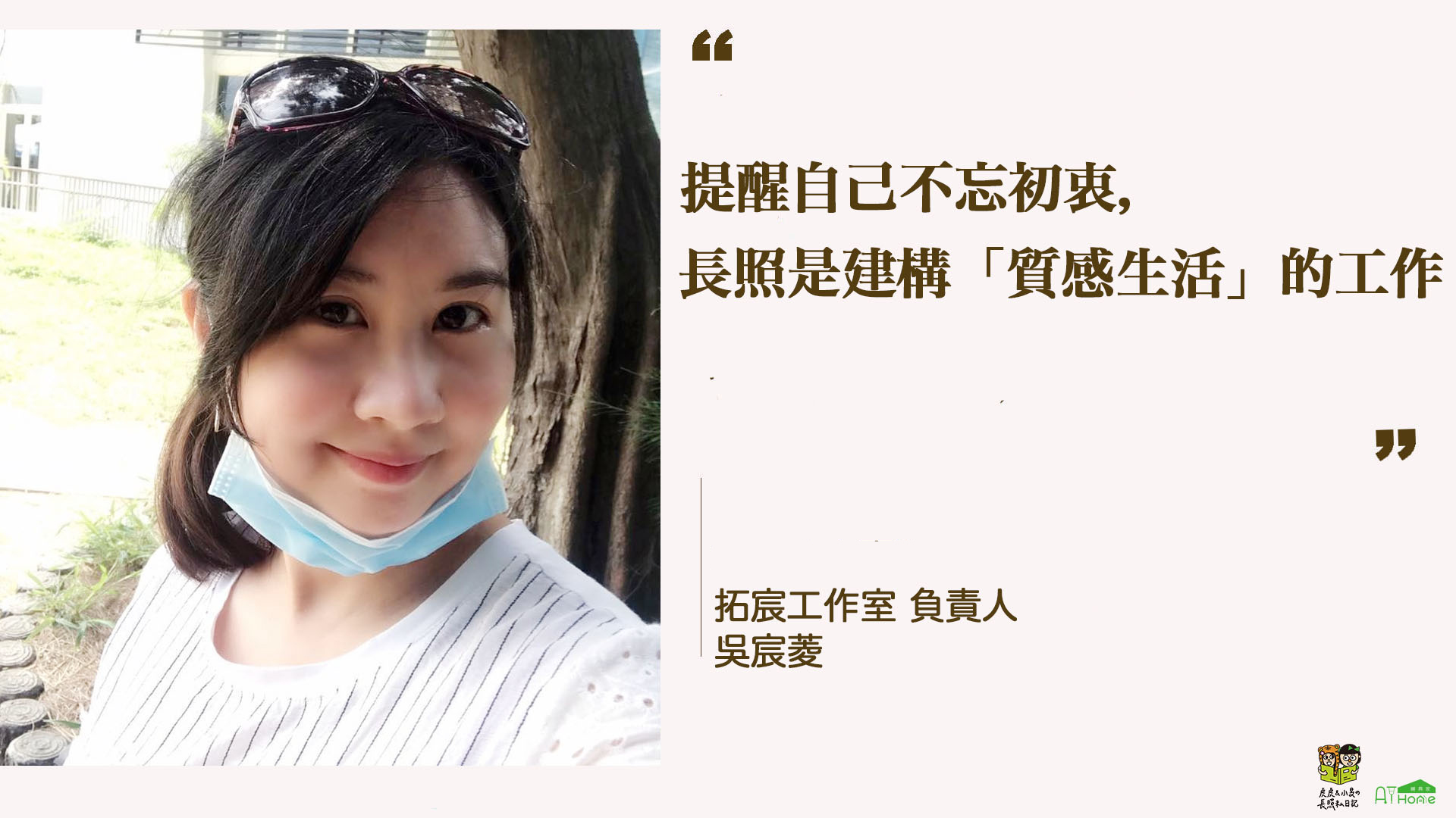 2021.10.31一位資深長照工作者的告白 吳宸菱:提醒自己不忘初衷,這是建構「質感生活」的工作個管師會利用資源手冊(附上照片、圖文)來關心個案,包括需不需要外出?需不需要就醫?家中是否有無障礙環境?是否該提出長照四包錢給案家申請?並且還要指導基本的衛教知識。個管師就像是是資源整合者,或是業務推廣者。當公費不能滿足個案的需求時,也該提出其他不同的自費方案來服務個案。 -