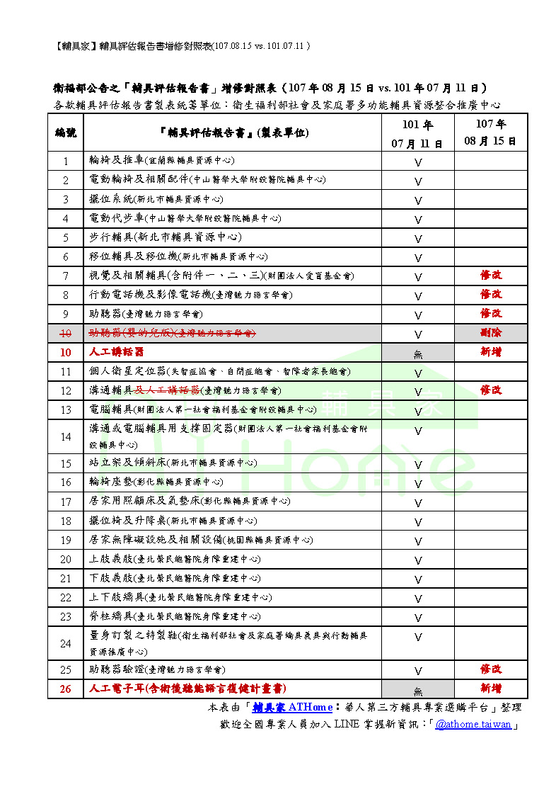 2018.08.30【懶人包】身障輔具補助基準表+輔具評估報告書增修對照(107.08.15vs. 101.07.11)家家為大家整理懶人包~~ -