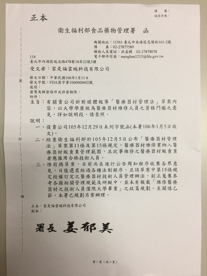 二、衛生福利部社會及家庭署另於2016年12月23日預告修正「身心障礙者服務人員資格訓練及管理辦法」部分條文,說明「為鼓勵更多人從事輔具維修技術工作,並考量實務運作及認定,爰增列第三款」,已於2016年12月27日正式發布於行政院公報中:https://goo.gl/CsfHFF