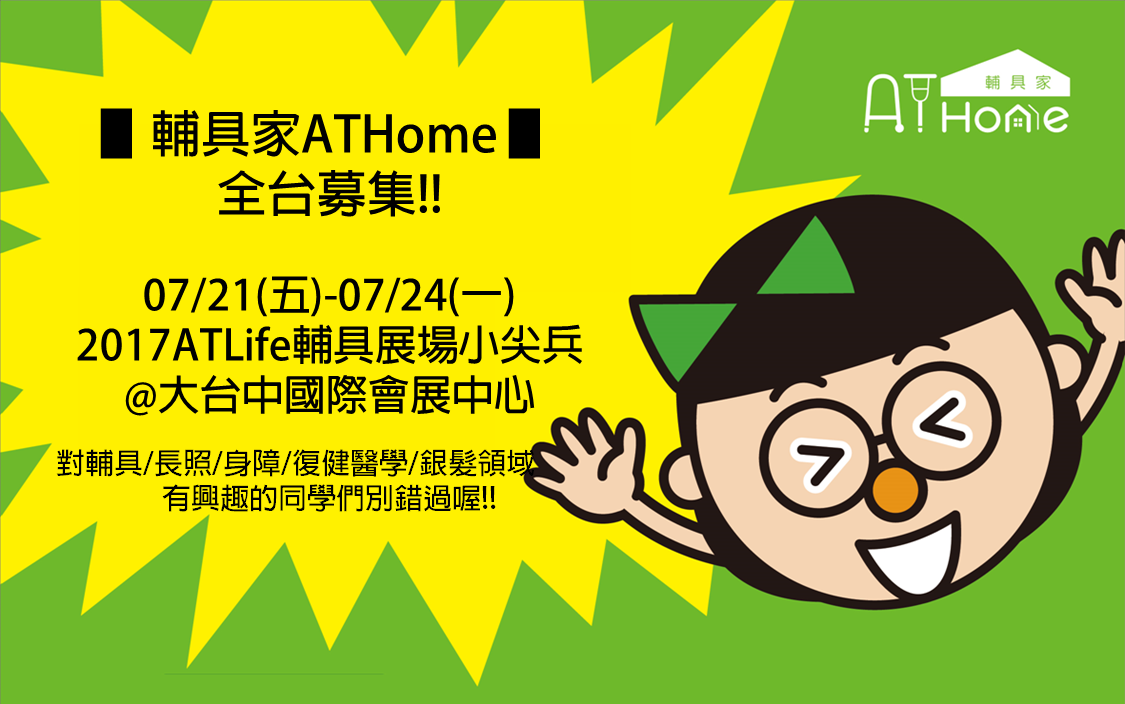 全台募集「輔具家ATHome」攤位小尖兵!! 07/21(五)-07/24(一) 「輔具家ATHome」攤位輔具小尖兵工讀 地點:大台中國際會展中心 我要報名:https://goo.gl/8MbEsG 輔具小尖兵將可獲得: #輔具家限量T-shirt #小尖兵工讀費:全天1,250 #中午便當 #瞭解台灣輔具使用者的需求 #認識台灣輔具產業品牌 對輔具/長照/身障/復健醫學/銀髮領域 有興趣的同學們別錯過喔!!