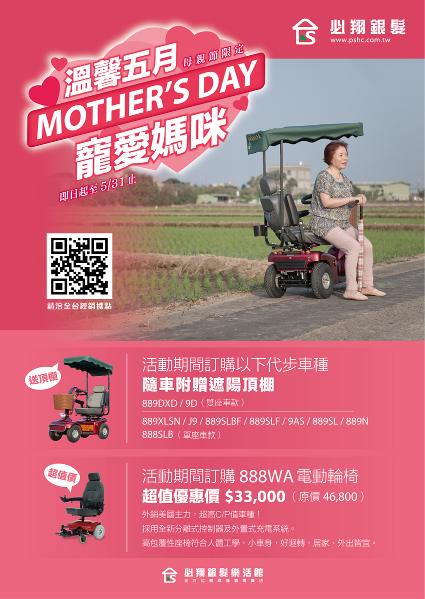一年一度的母親節,正是寵愛媽咪的絕佳時機,必翔銀髮即日起至5月31日止,推出「愛無礙.傳馨意」優惠活動。活動期間,必翔品牌外銷歐美、最高C/P值的電動輪椅TE-888WA,只要33,000元即可入手;凡購買指定電動代步車車款,就加送遮陽頂棚,讓長輩出遊不怕太陽曬。