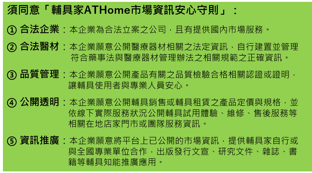 ➽一、「輔具資訊 安心守則」:不只第三方,更重要的是,要成為能讓消費者安心的資訊情報網絡。目前輔具家的所有市場情報資料,已經都是由資料源頭的「原廠品牌」上架,然後由原廠自行設定「全國原廠合作授權之在地門市清單」,再由「在地門市」決定是否另外付費於平台上公開各自情報資訊。2020年9月起,所有希望上架輔具家平台的店家,包含原廠品牌企業、清潔消毒租賃中盤商企業、在地服務門市團隊企業,皆須同意並遵守「輔具家ATHome市場資訊安心守則」,才可租用系統並上架資訊。包含須經確認:合法企業、合法醫材、品質管理、公開透明、資訊推廣。