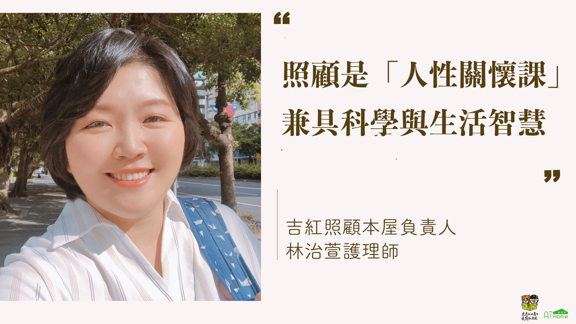 曾經是公共衛生護理師,也是社區護理師、授課講師、簡報高手等等多重身份的Maya林治萱,隨時都能從她清晰又靈活的腦袋裡,想出一個個厲害的照顧計畫來!在她神清氣爽的笑容下,她從不諱言,自己也是長期照顧者。能夠同感他人的辛苦,是她的親身體會,只是她輕輕提起,也輕輕放下。