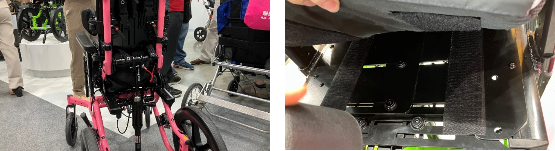 Sandy自己過去曾經有當過腦麻志工,發現志工們需要花費蠻大的心力來餵食,手臂可能需要繞一邊來固定孩童的位置,因此向工作人員詢問是否有相關的設計來減輕照護者的負擔,原來擺變袋鼠的配件十分全面,目的是為了盡力滿足坐姿需求,其中有包含胸側撐-可固定上肢位置、臀側撐-可以固定大腿、還有膝外支撐 等等,讓孩童擁有良好的坐姿,同時也能減輕照護者本身的負擔。