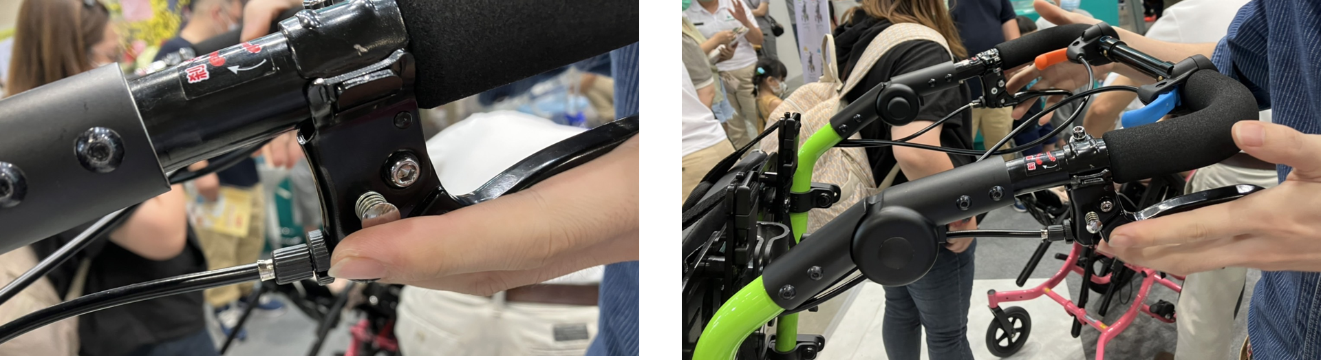 同時也為了減輕照護者的負擔,希望減少操作輪椅剎車和配合輪椅高度要不斷彎腰的問題,新增「鼓式煞車」和「橫向推把」2項裝置設計,橫向推把不僅可以簡單的調整照護角度減少彎腰的發生,同時也可以調整輪椅角度,使輪椅能夠在空中變換不同角度,舒服或坐或躺。