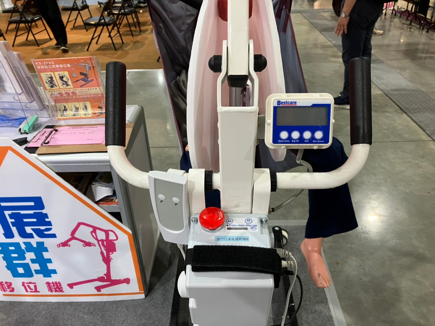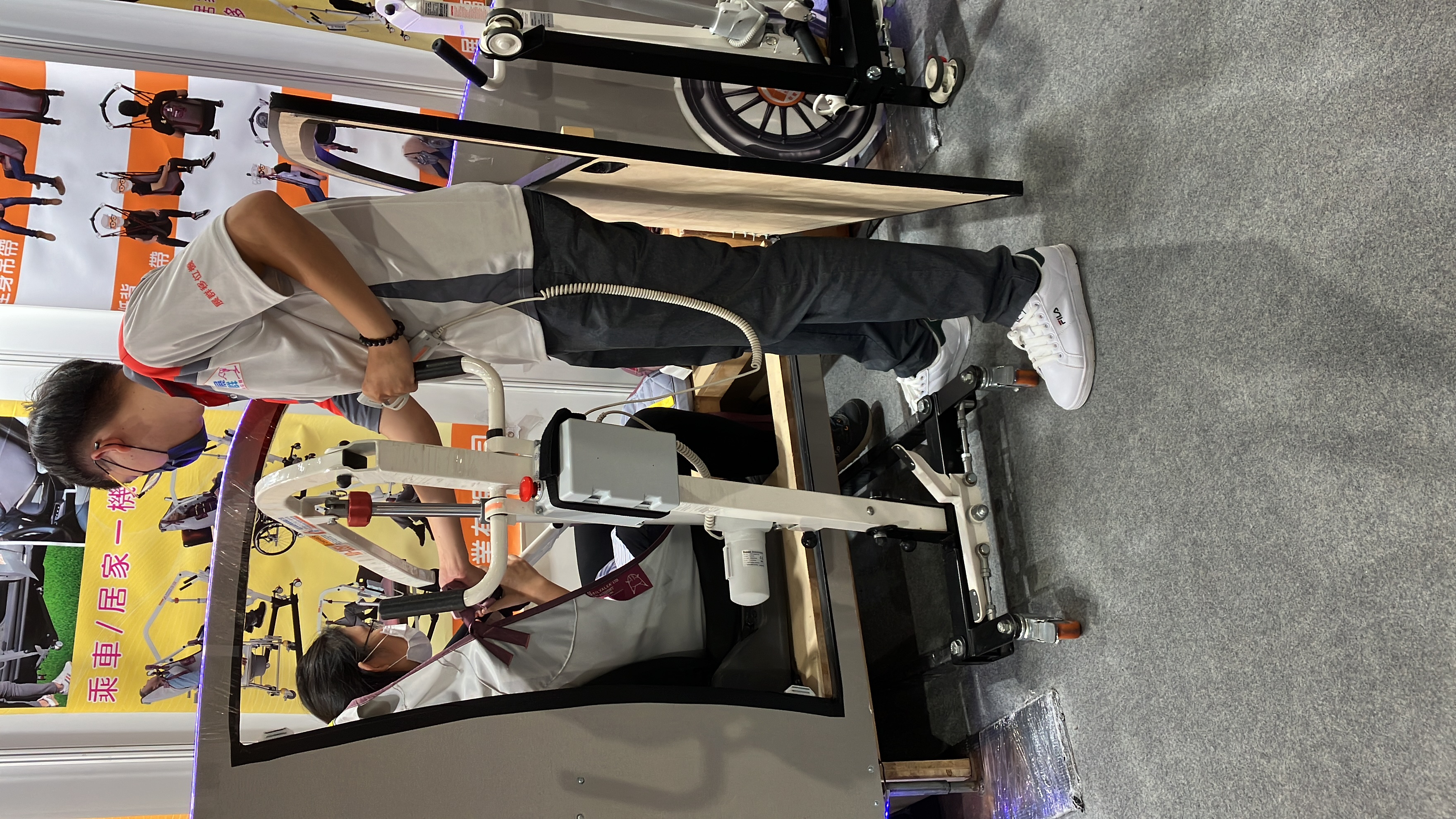 第六站展群,低頭一看時間已是中午時分,工作人員分別輪流去用餐,而且為了民眾有最佳的使用體驗,工作人員個個馬不停蹄的服務民眾,從他們辛勤的背影和努力的腳步,可以感受到他們對於這個行業的熱情以及想要為大家服務。的心。站在攤位外觀察著各類移位機、展群貼心地為使用者調整吊帶長度。讓初來乍到的我十分好奇接下來會遇到什麼樣的亮點產品呢。