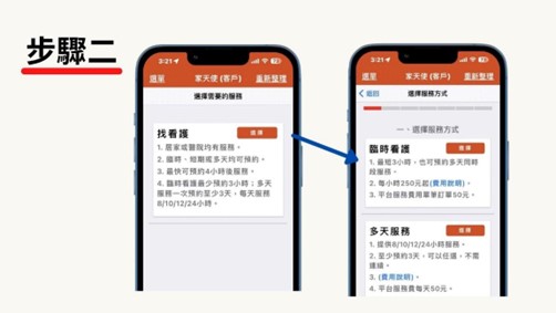 按照流程指示,選擇找看護並選擇服務類型,若是想要24小時醫院看護,可以選擇『多天服務』;若是想要陪長輩看醫生、短時數的服務,可以選擇『多天服務』,後續按照流程建立服務對象資料以及預約單相關資訊。