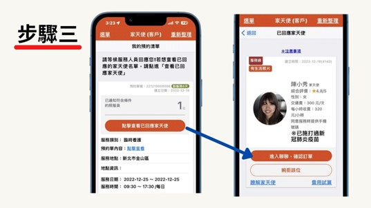 當有照服員回應時,可至『預約』頁面的『查看已回應家天使』,查看目前回應的照服員名單以及相關資訊,並可以按『進行聊聊,確認訂單』,即可與照服員聊聊溝通;若是有中意人選,於該人員的聊聊介面右下角有『確定人選』即可進行選擇。