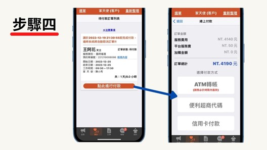 確定人選之後,當照服員也確認接單,即可至『預約』頁面按『點此進行付款』進入付款流程,按照流程做下去,可以選擇用『ATM』、『超商代碼』以及『信用卡』這三種付款方式。