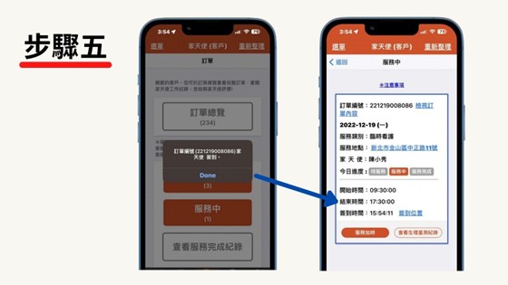 當預約單付款完成,照服員即會依照指定的時間前往指定的地點服務,並進行工作簽到、服務回饋、工作簽退與填寫工作日誌等流程,若是服務過程中有疑問,或是服務有變動,都可以來電客服(0800-202-555)詢問。