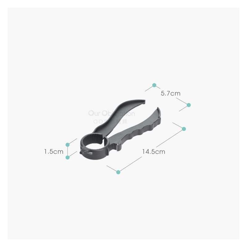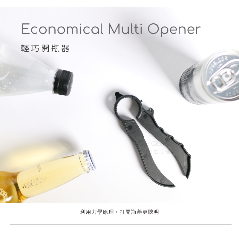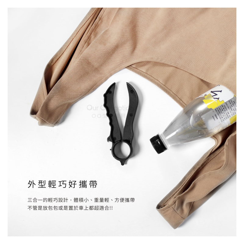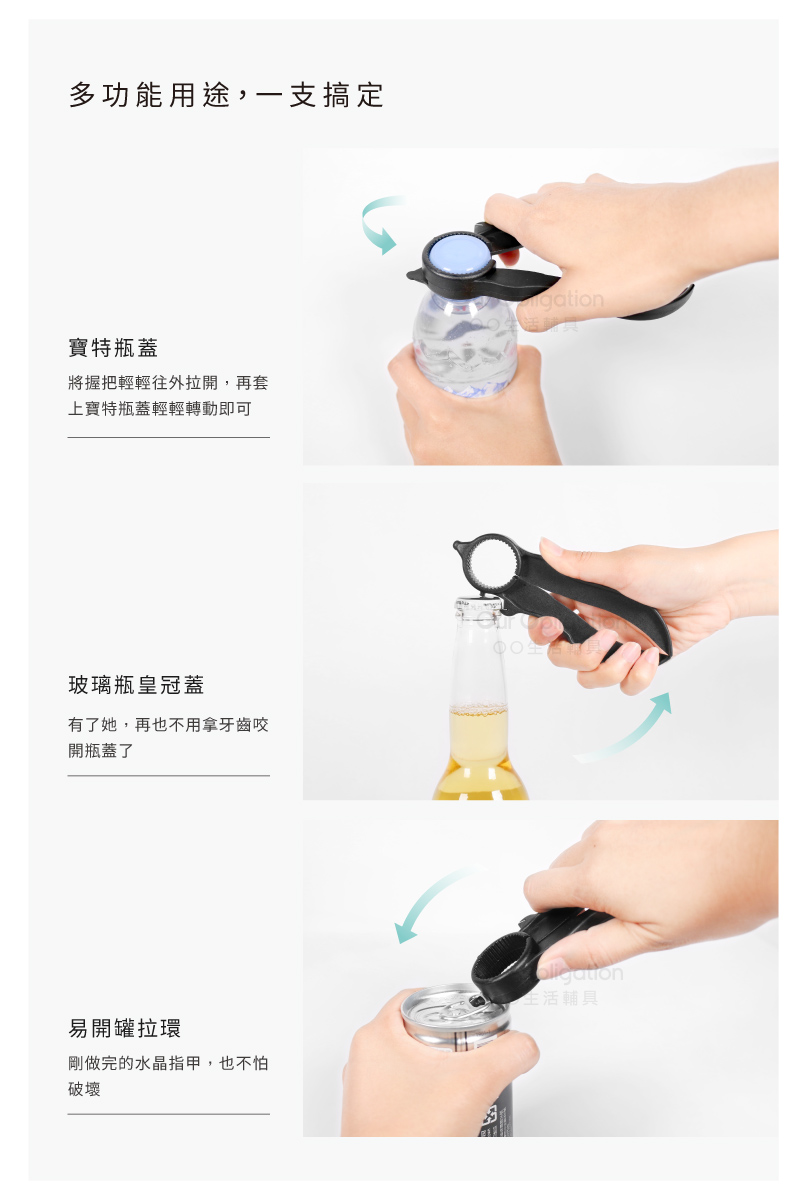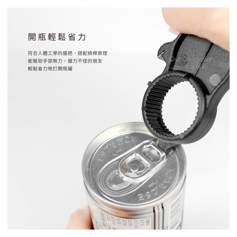 輕巧開罐器適用於開啟寶特瓶蓋、易開罐、及玻璃瓶蓋。