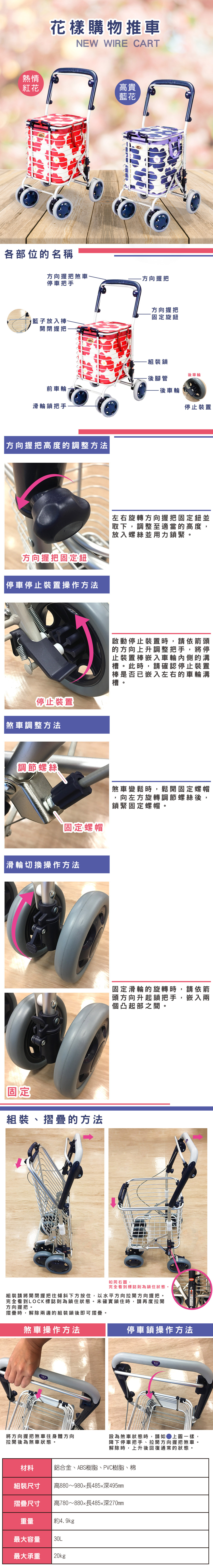 材料:鋁合金、ABS樹脂、PVC樹脂、棉組裝尺寸:高88~98×長48.5×深49.5(cm)摺疊尺寸:高78~88×長48.5×深27(cm)重量:約4.9(kg)最大容量:30(L)最大承重:20(kg)
