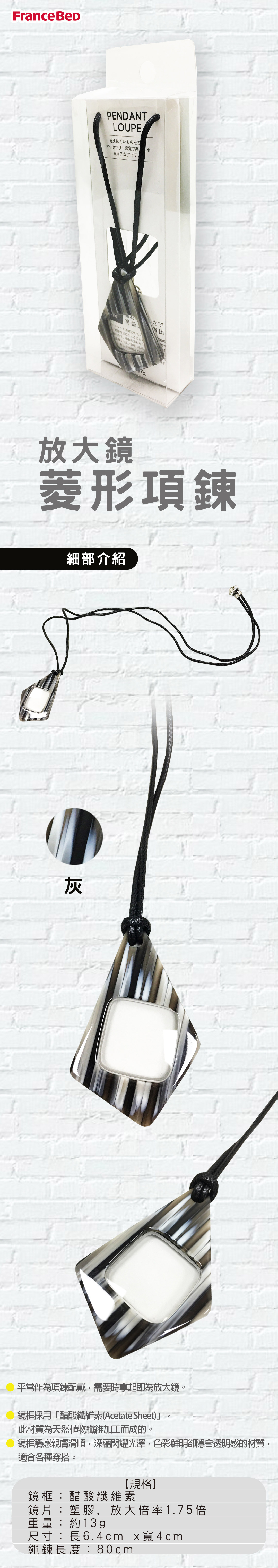 鏡框:醋酸纖維素鏡片:塑膠,放大倍率1.75倍重量:約13g尺寸:長6.4cm x寬4cm 繩鍊長度:80cm