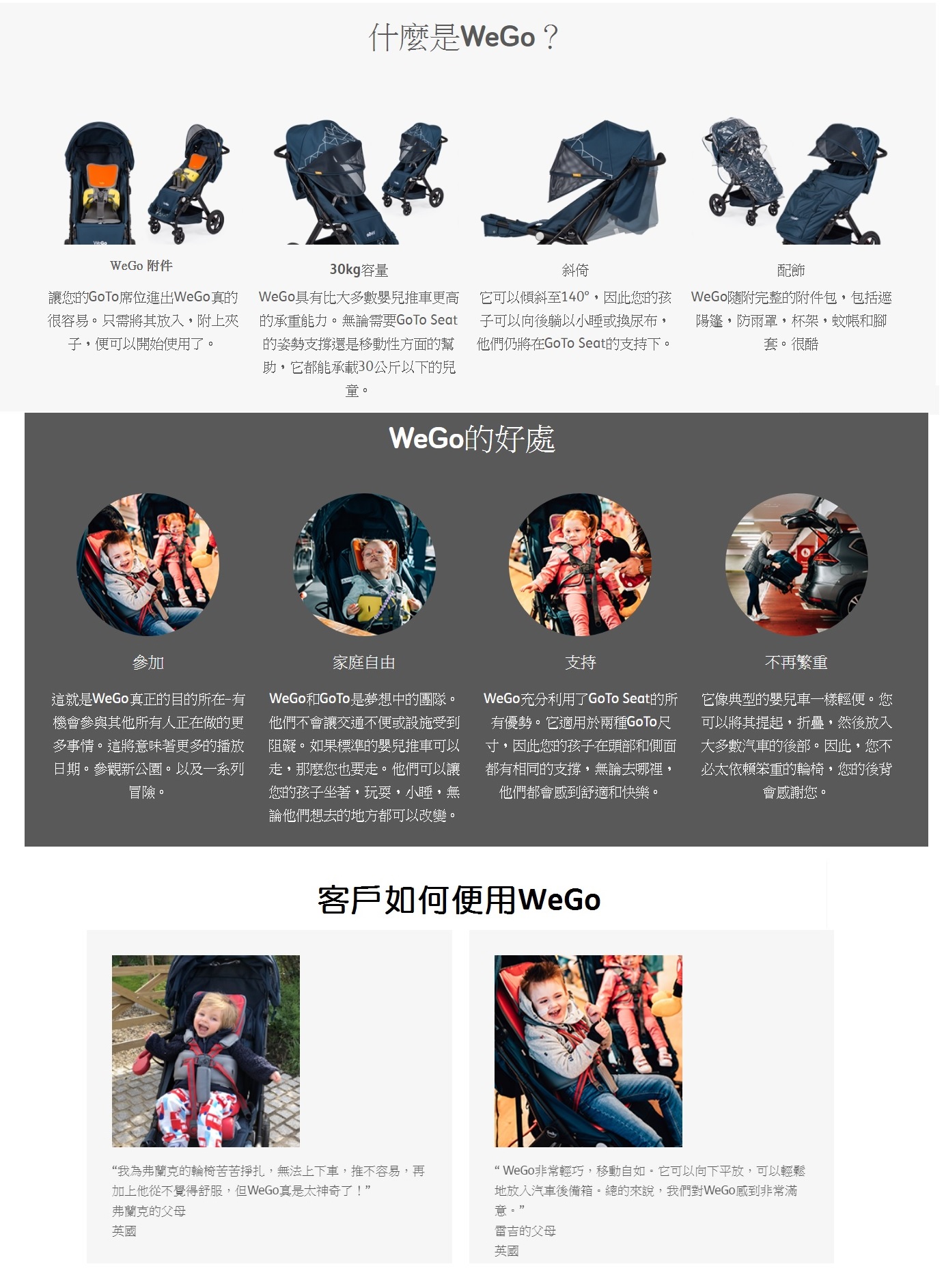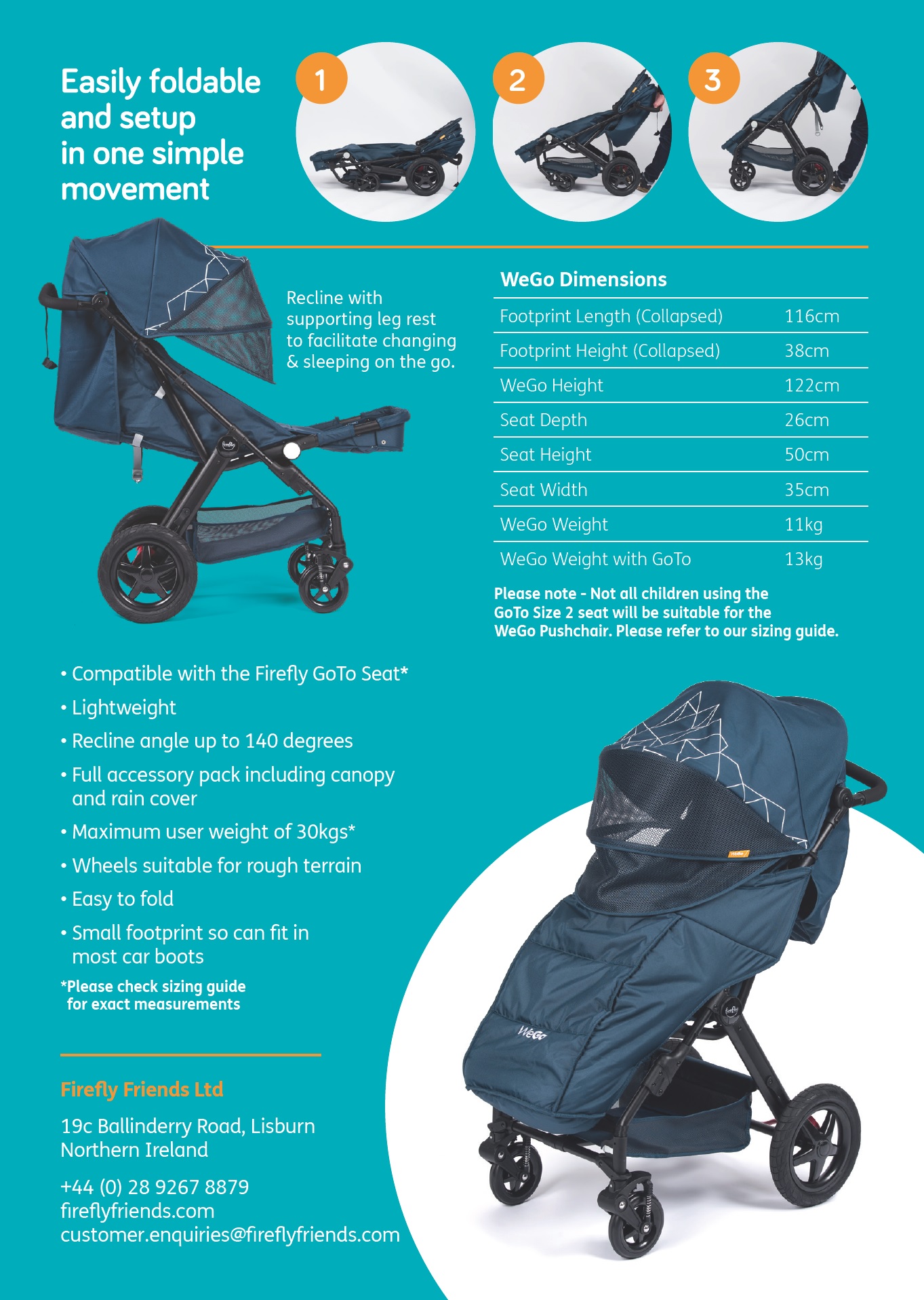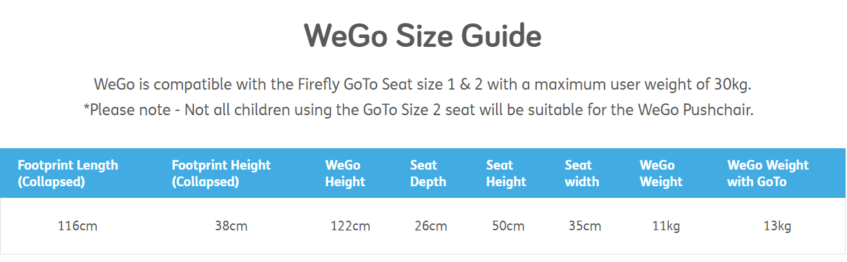 它與Firefly GoTo座椅尺寸1和2相容,可為可能需要更多姿勢支撐的兒童提供額外的上身支撐。 如果沒有GoTo座椅,WeGo仍將為行動不便的孩子提供支持,適合最大使用者體重30公斤的兒童。遠遠超過大多數嬰兒車。