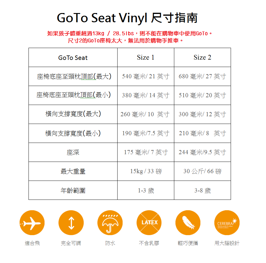 * 適用於1-8歲的兒童,最大使用者體重為30kg / 66lbs。