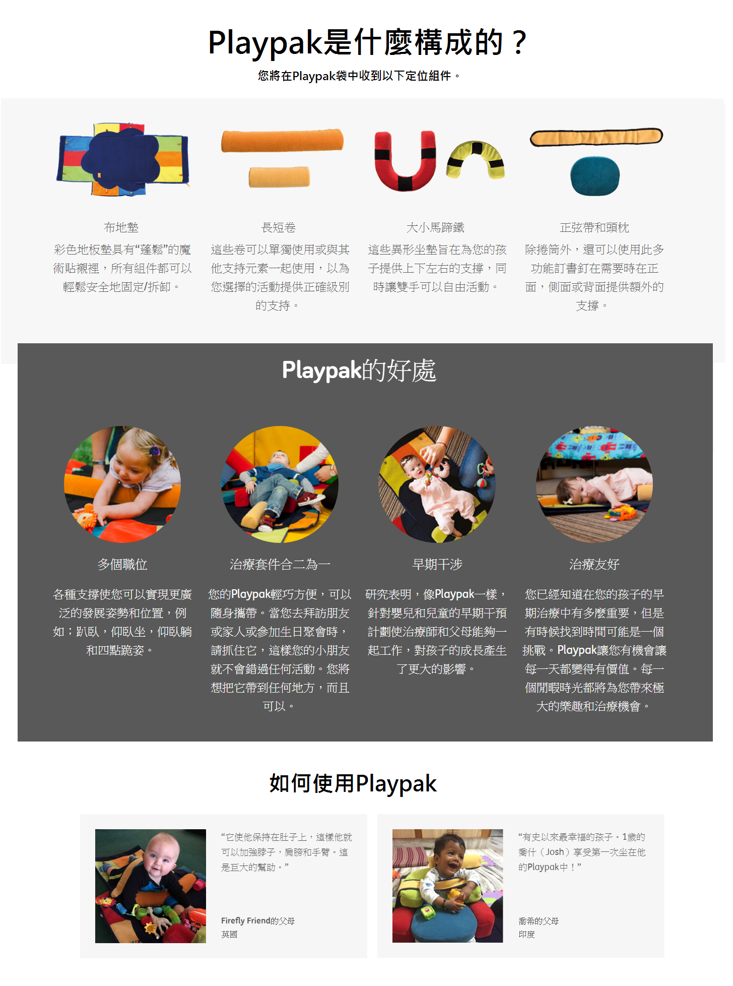 Playpak還附帶了一個方便的治療指南,其中包含建議和易於使用的說明,向您展示如何使用每個聰明的小東西來創建不同的坐姿和臥姿,以及如何與孩子一起進行所有推薦的發育遊戲。