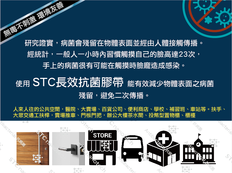 研究證實,病菌會殘留在物體表面並經由人體接觸傳播。經統計,一般人一小時內習慣觸摸自己的臉高達20次,手上的病菌很有可能造成感染。使用STC長效抗菌膠帶能有效減少物體表面之病菌,