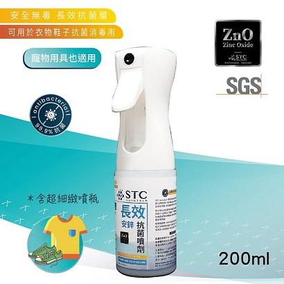 STC Nanotech 獨家研發安鋅長效抗菌噴劑,內含30奈米粒徑氧化鋅抗菌材,經專業乳化技術讓奈米氧化鋅抗菌材平均且穩定分散,在物體表現形成一主動抗菌層。