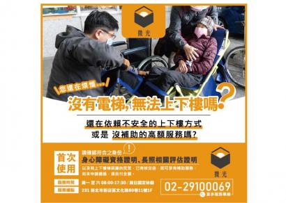 提供接送服務、爬梯機服務。服務價格視上下樓層、接送起訖點,及是否具(中)低收入戶身份決定,歡迎預約詢問~