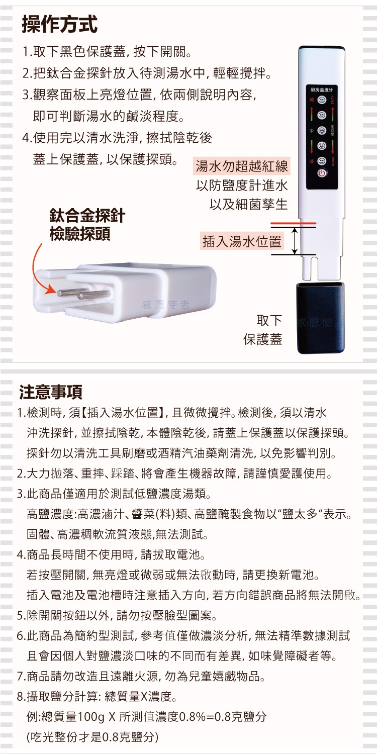 | 鹽度計-簡約型 ZHCN2335 | 鹹淡檢測 飲食控制鹽份攝取 | 點我下載 |