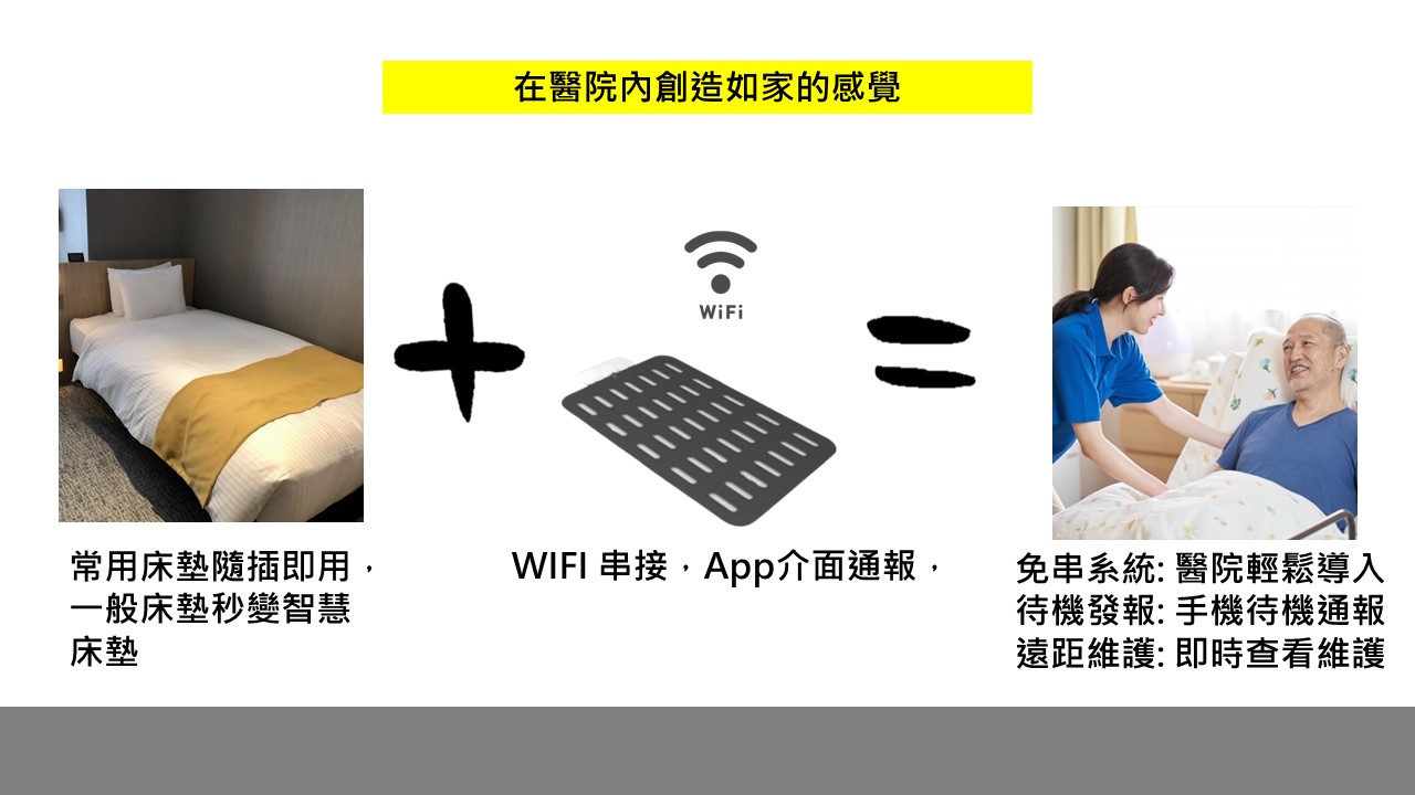 我們期望在不改變原有生活習慣下,提供心領神會的照顧服務。盡孝變得簡單,讓老人得到真正的尊重。依此信念開發一種能夠達到協助照護者“非穿戴式且能適用大部分床墊”的照護輔助工具。